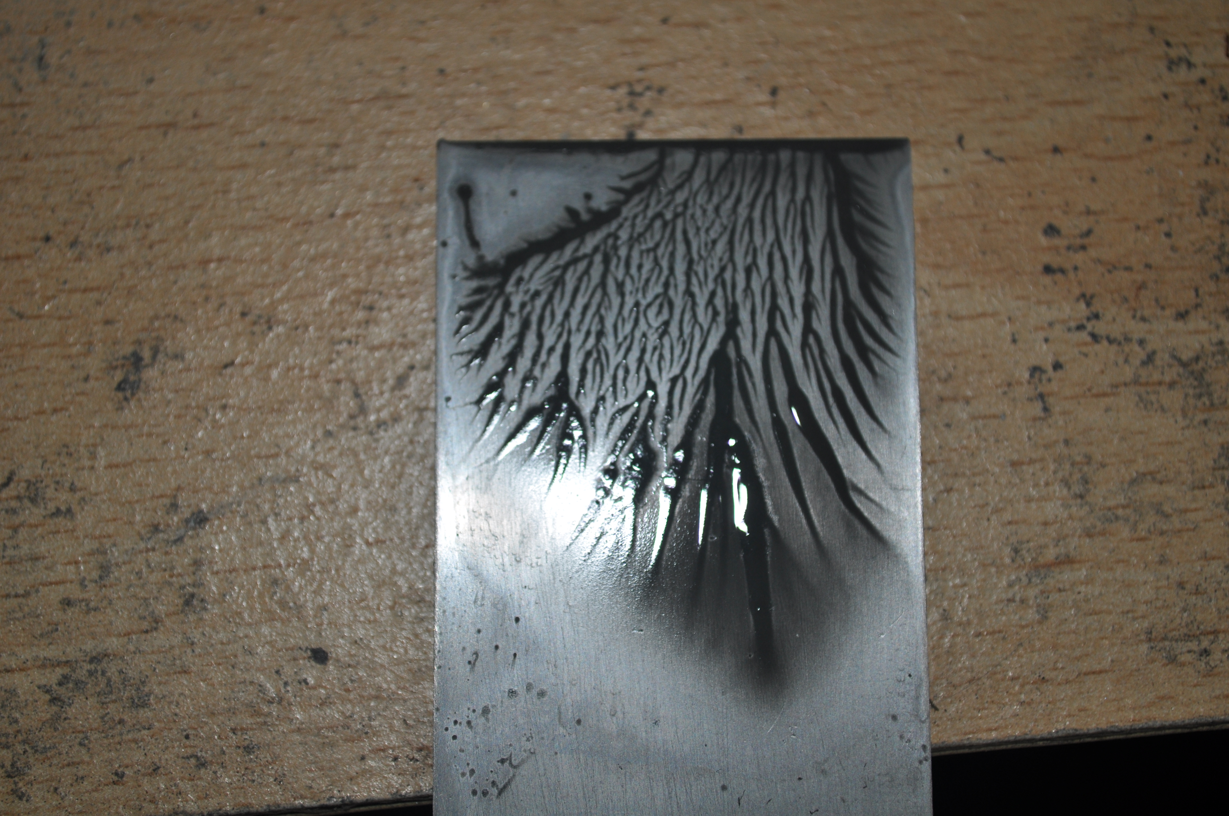 This is a pattern that appeared on a piece of steel that I was polishing prior to etching. I was polishing using a fine grit paper and the dark pattern is the removed material. I found this pattern very interesting because it appears to be fractal in nature.