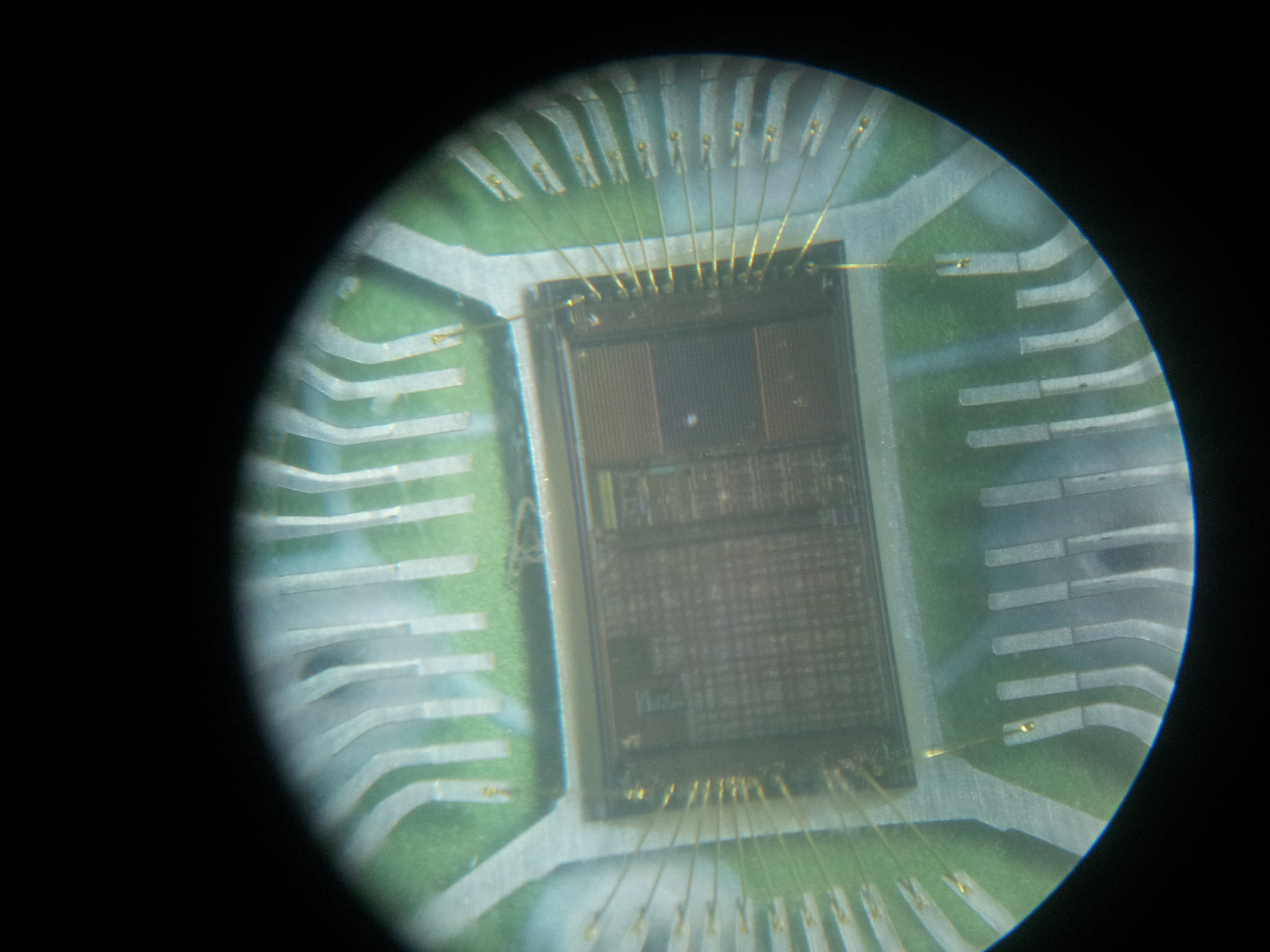 This is a photograph taken down a microscope of an integrated circuit. This integrated circuit is from a microsoft optical mouse. On this silicon die you can see the CCD and also the data processing structures.